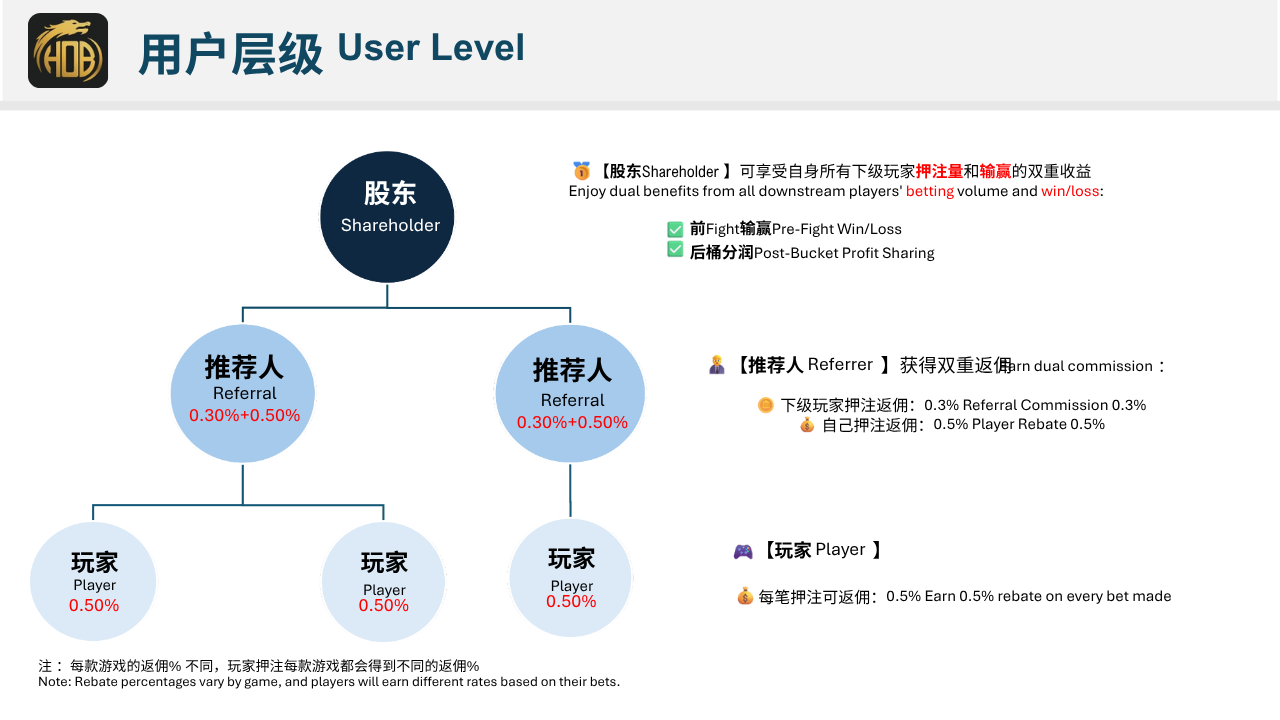Earn dual benefits from all downstream players, including betting volume and win/loss through Pre-Fight and Post-Bucket profit sharing.