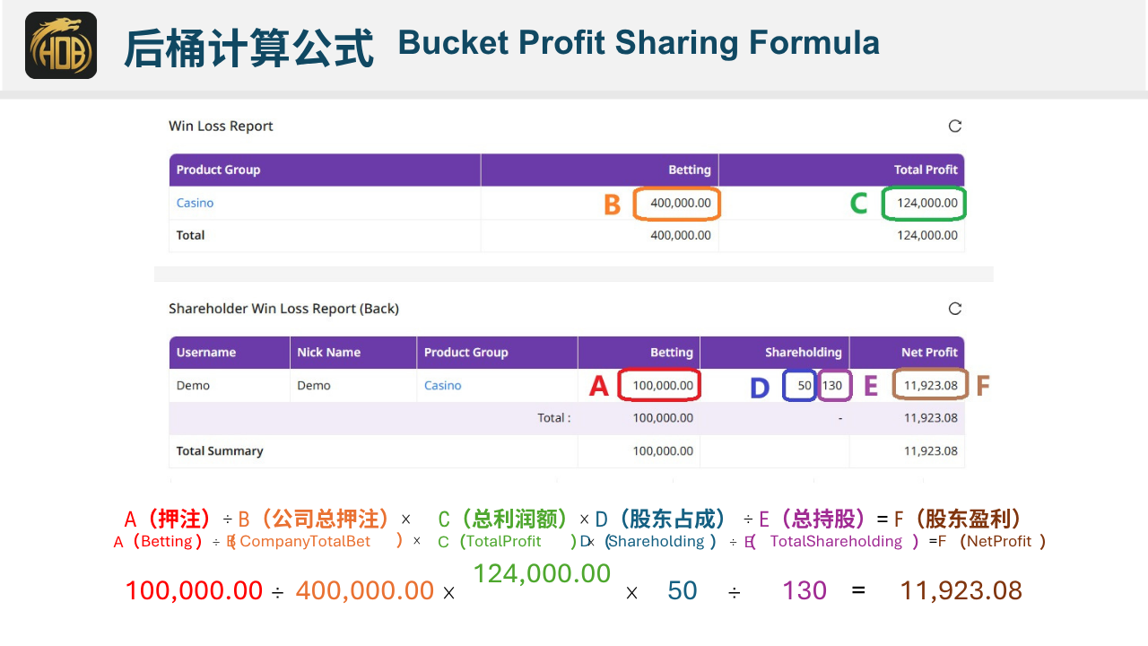 A (Betting) ÷ B (Company Total Bet) × C (Total Profit) × D (Shareholding) ÷ E (Total Shareholding) = F (Net Profit).